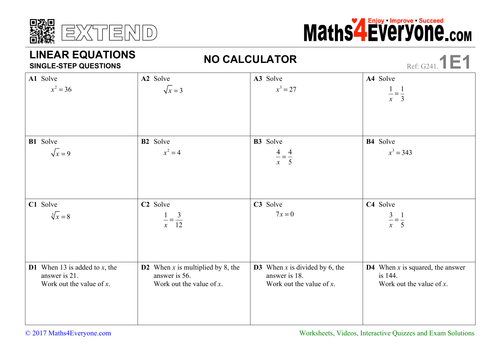 Worksheets for linear equations - Homeschool Math Choose the types of equations generated for the worksheet. Choose AT LEAST one type. Type 1: one-step equations (the simplest possible, such as x + 6 = 19 or 6x = 17 or x/7 = 18) nonnegative solutions only. Type 2: other one-step equations (such as 4 = 8 − x) nonnegative solutions only. Type 3: one-step equations where you first need to ...
